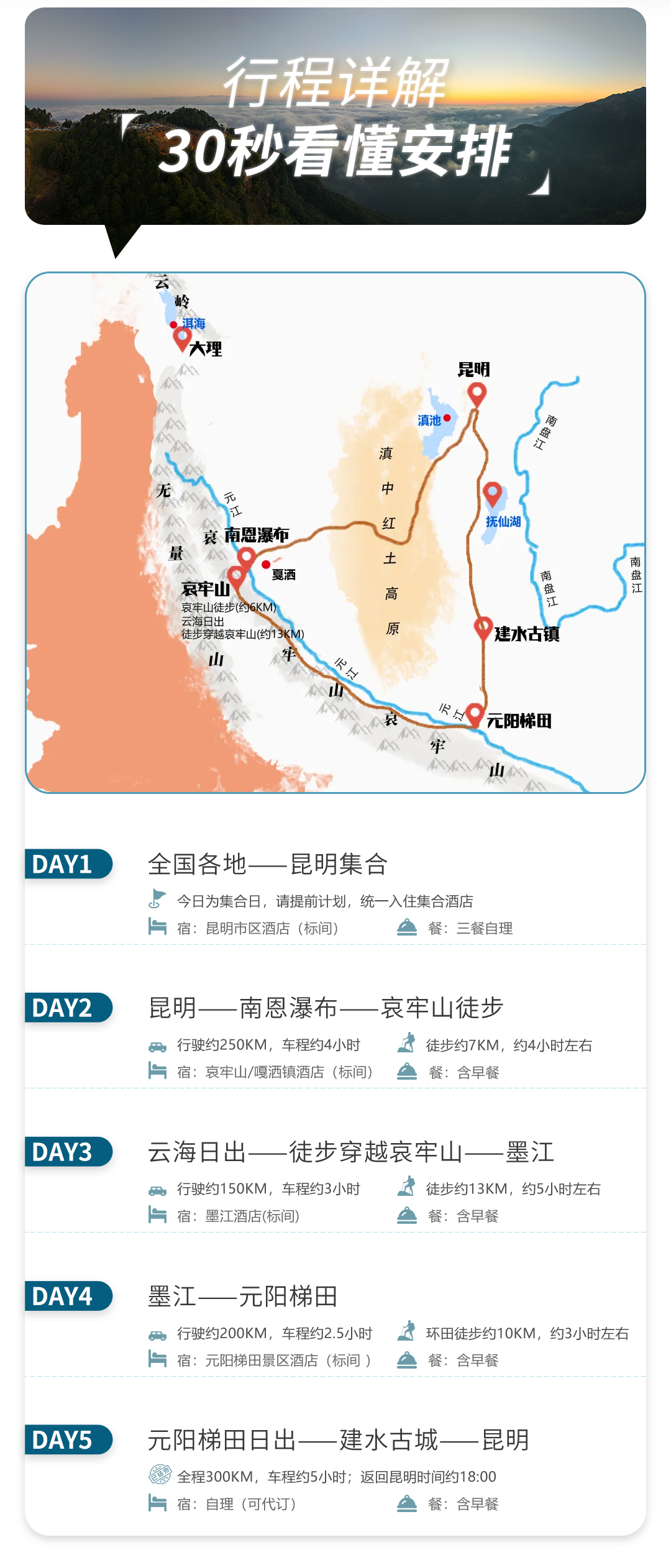 (3)行程第一天为昆明集合时间,当天抵达昆明即可,第二天早上在集合酒店出发(节假日日出发时间会比较早)。正常情况下,行程最后一天约18:00抵达昆明南站,19:00抵达昆明机场,建议预定21:00后的机票。