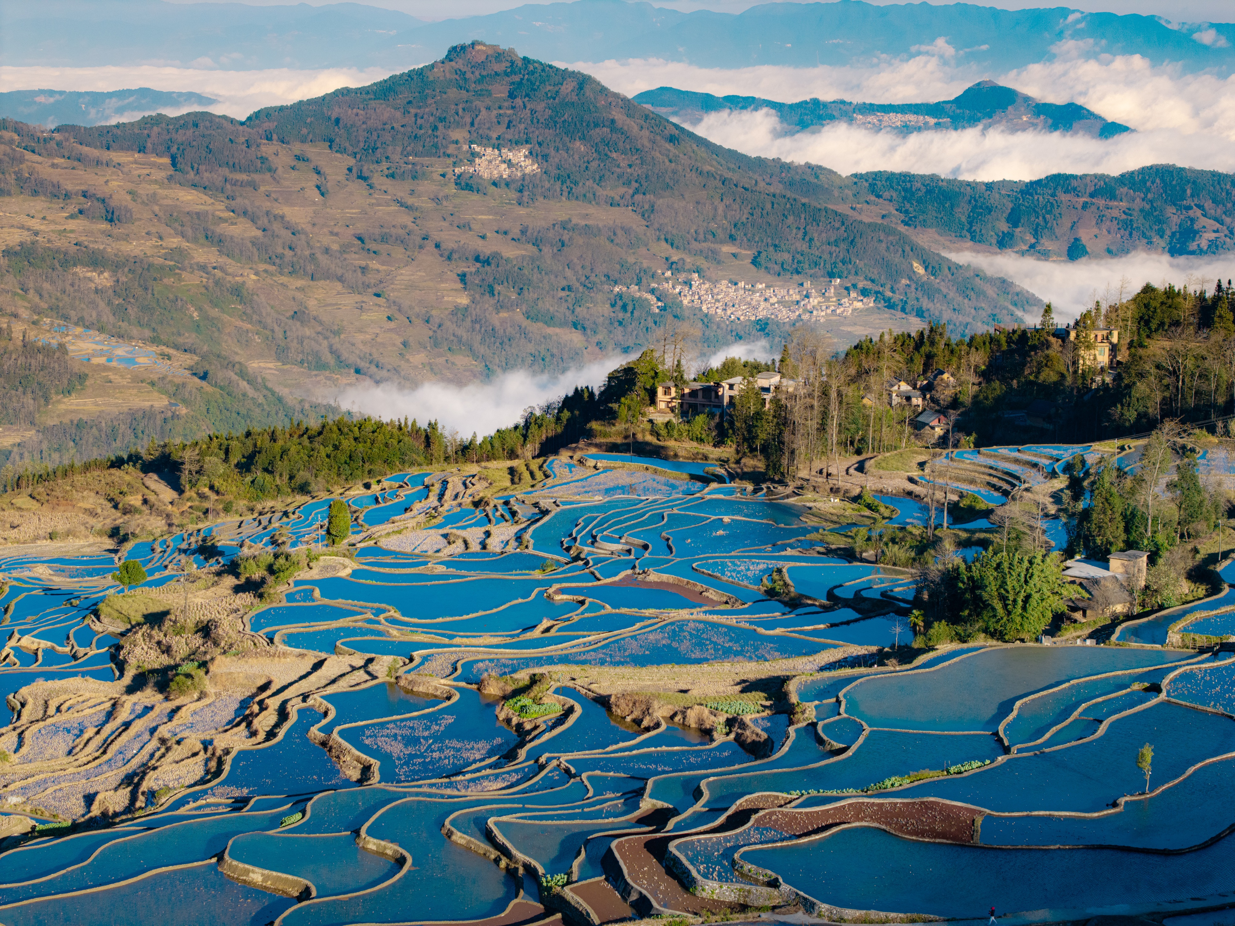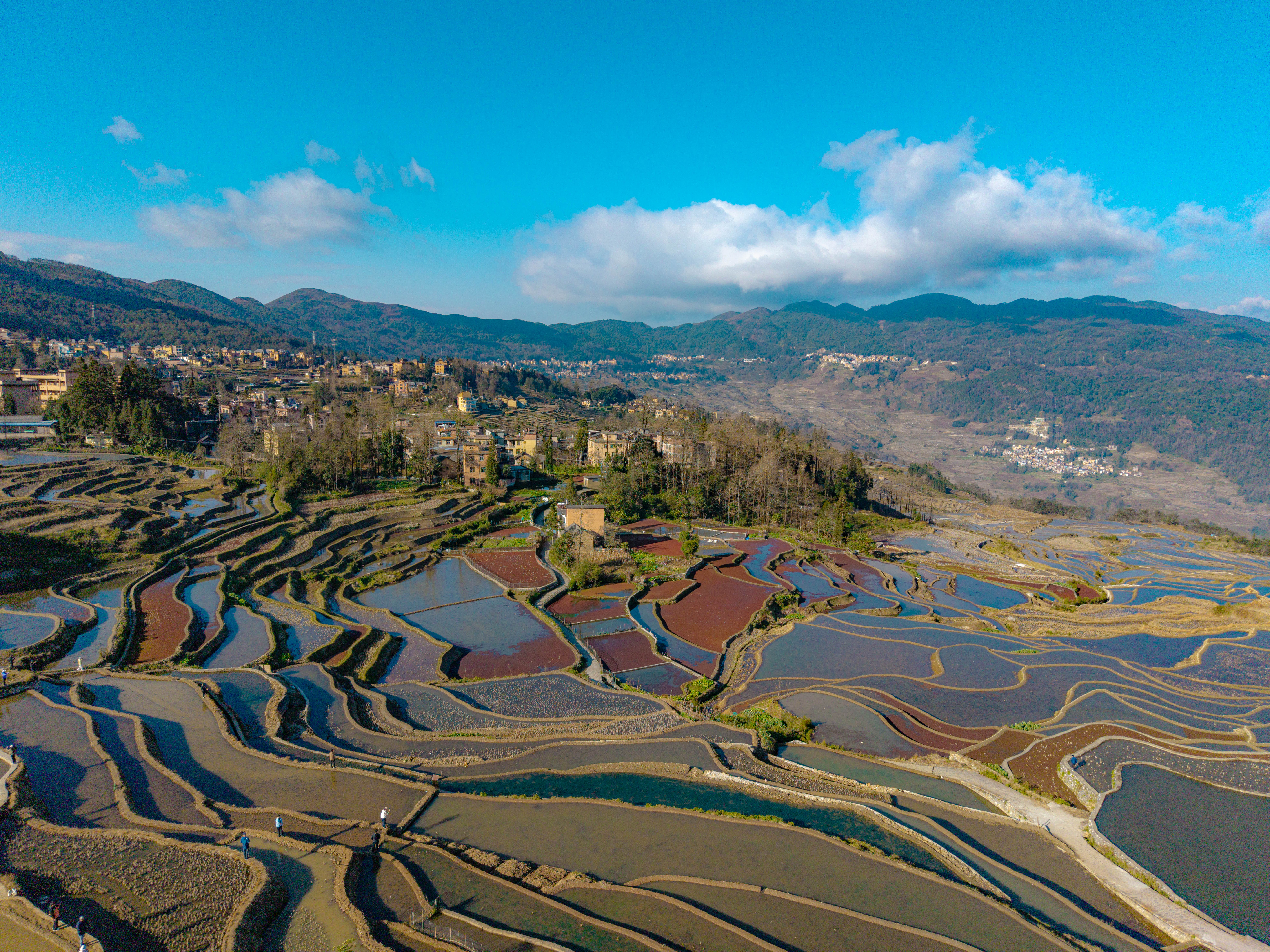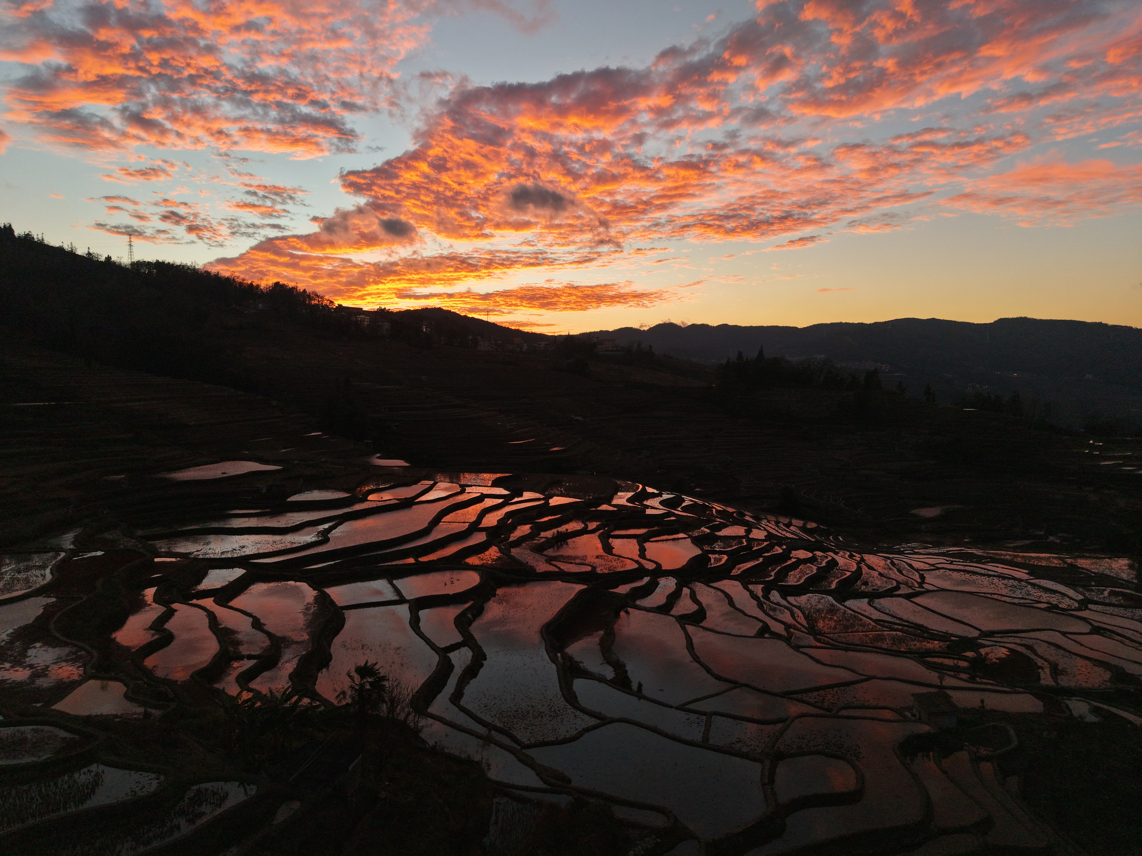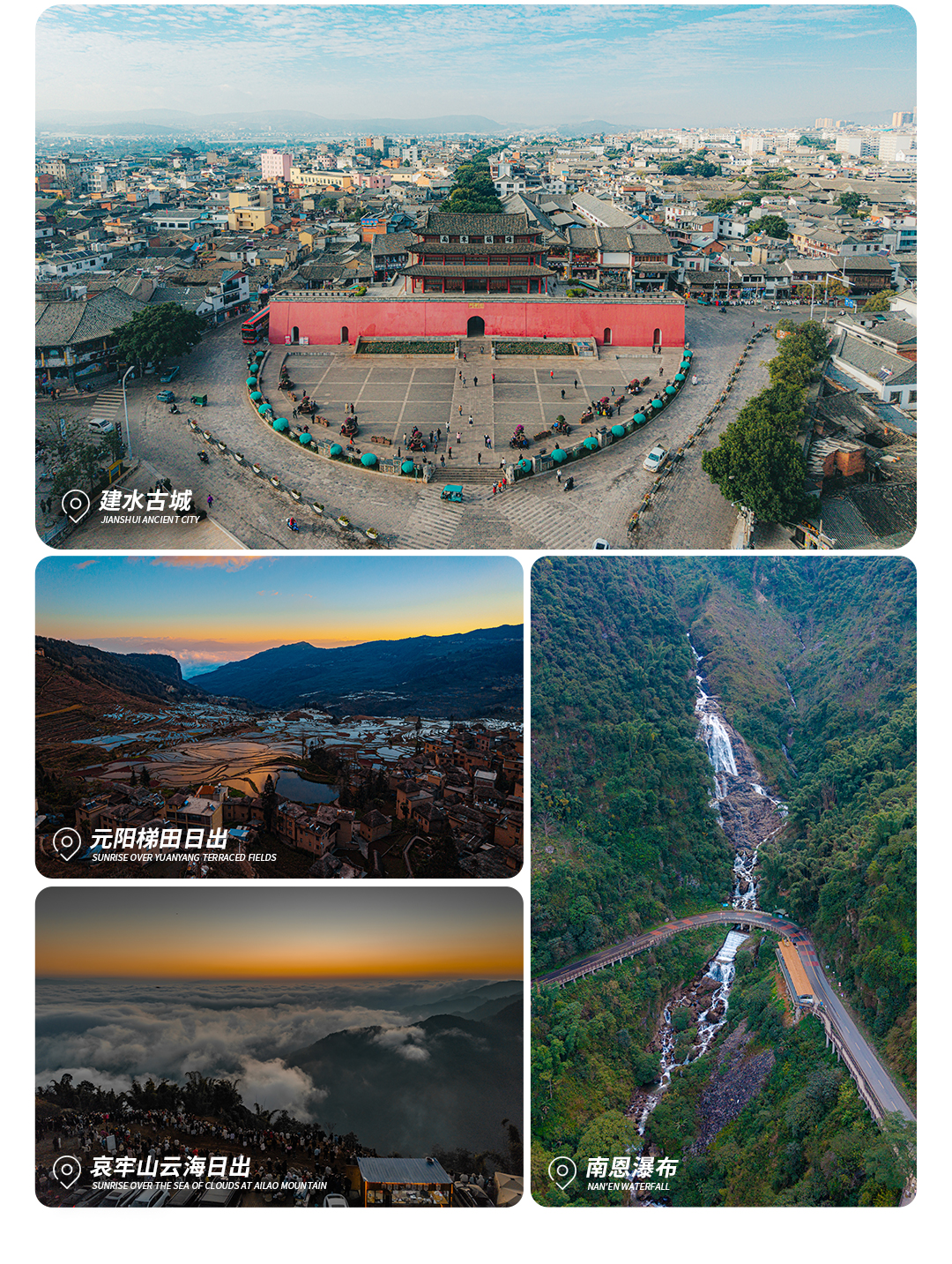 今天早起奔赴多依树观景台,静候日出盛景。天际由深蓝渐褪为浅紫,终被绚烂金黄铺满。梯田如镜,将天光云影的瞬息万变尽数复刻,时光仿佛在此定格。随后转场爱春蓝梯田,晨光穿云破雾的瞬间,万亩梯田化作蔚蓝镜面,天水一色,光影成诗。行程继续,我们驱车前往建水古城。漫步古巷,文庙的沉静庄重扑面而来;街巷间的市井烟火更添鲜活 —— 老茶馆茶香悠悠,摊贩叫卖声朗朗,市民悠然踱步,勾勒出建水古城独有的生活画卷。